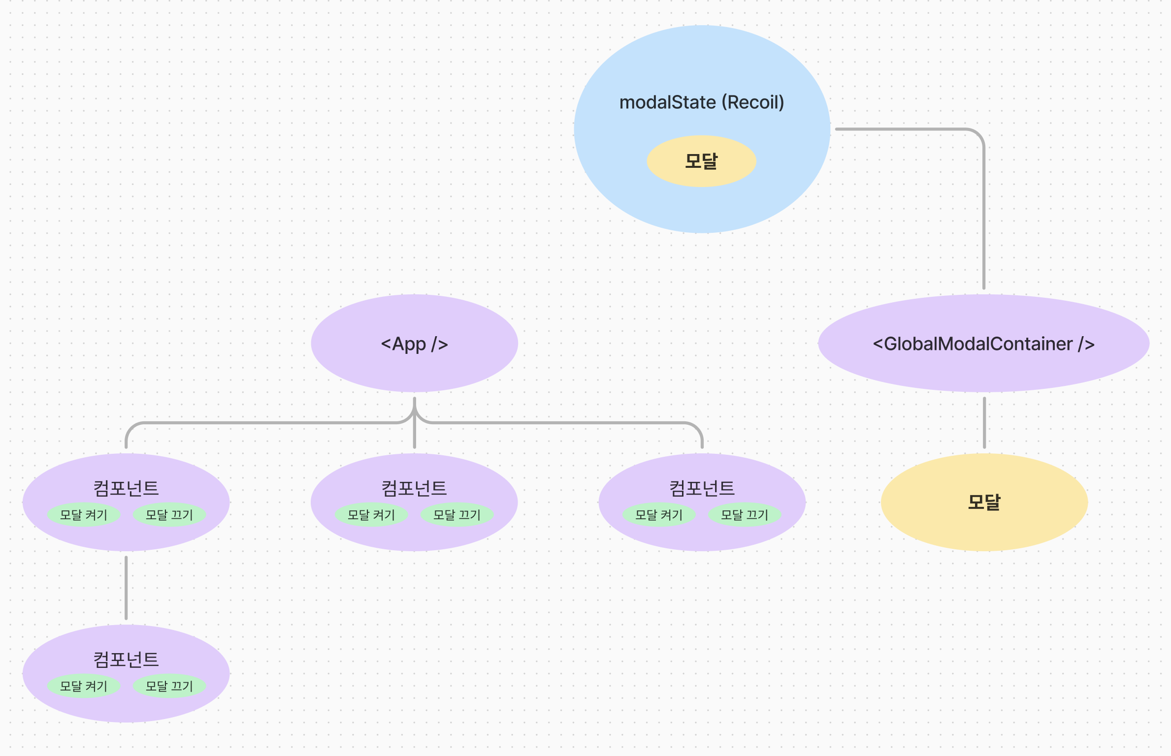 전체적인 구조도를 그리면 다음과 같습니다. 전역 상태에 모달 컴포넌트 자체를 올려놓고, GlobalModalContainer에서 모달을 그대로 화면에 렌더링시켜주는 방식입니다. 프로젝트의 index.js에서 <App /> 컴포넌트 바로 하단에 GlobalModalContainer를 위치시켜 루트 요소 바로 하위에서 모달이 렌더링 됩니다. 그렇기 때문에 createPortal을 사용하지 않고도 부모 요소로부터 CSS의 영향을 받지 않을 수 있습니다.