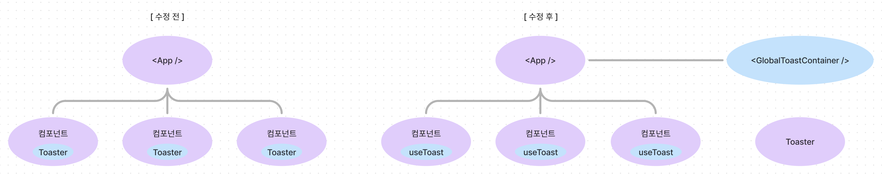 게다가 토스트 관련 코드가 컴포넌트 코드 전체에 분산되어 있어 보기에도 불편합니다.