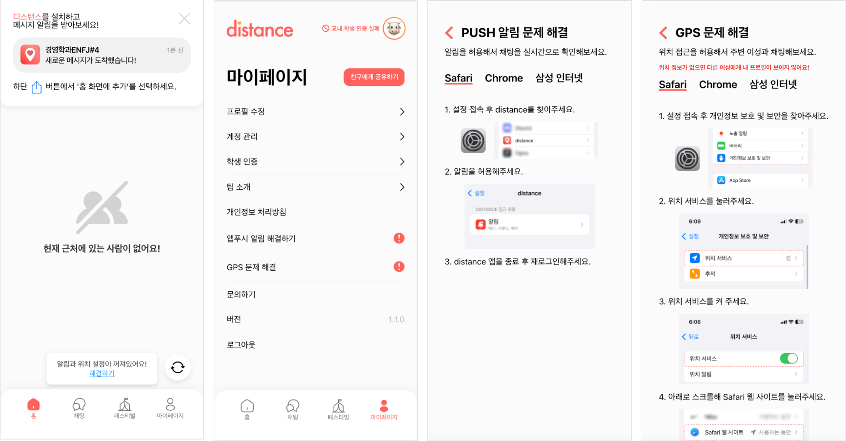 알림과 GPS 설정은 디스턴스에 있어 매우 중요한 기능이지만,