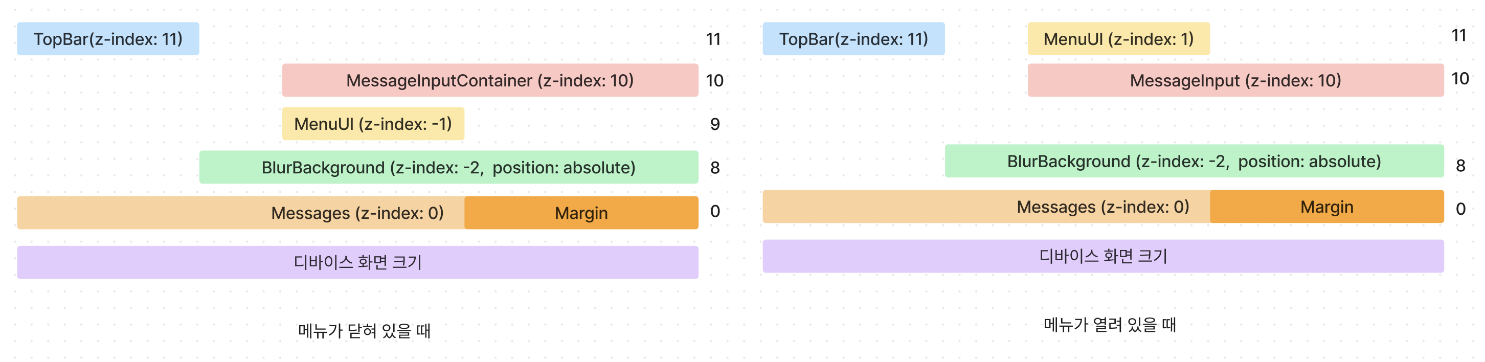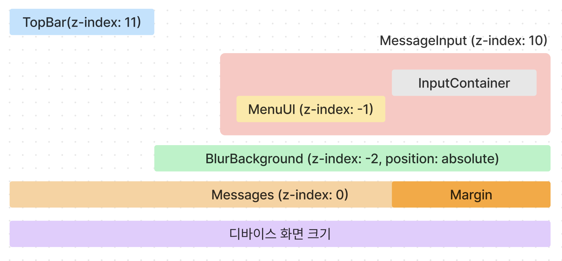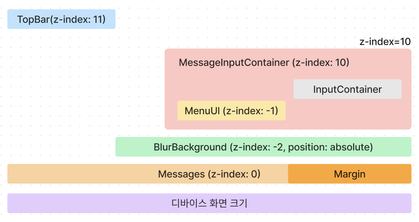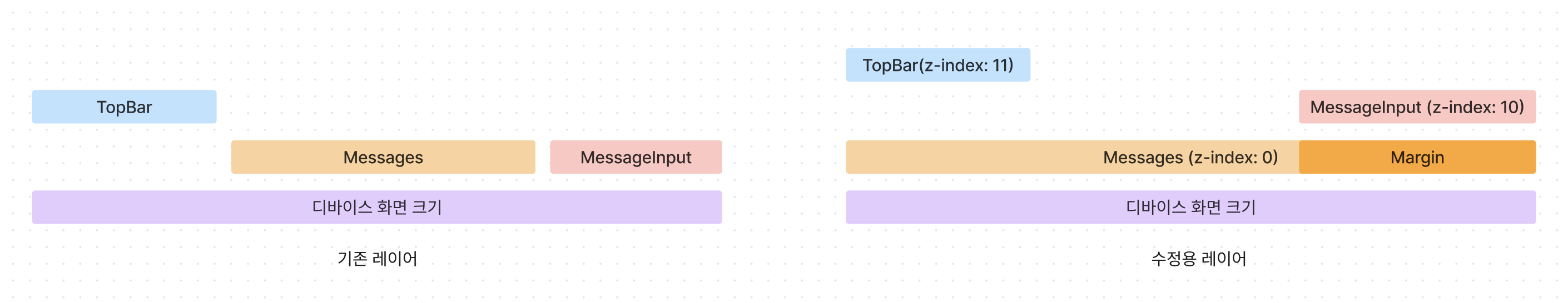 기존의 화면은 TopBar가 가장 위에 위치하고 Messages와 MessageInput의 z-index 높이가 모두 같았습니다.