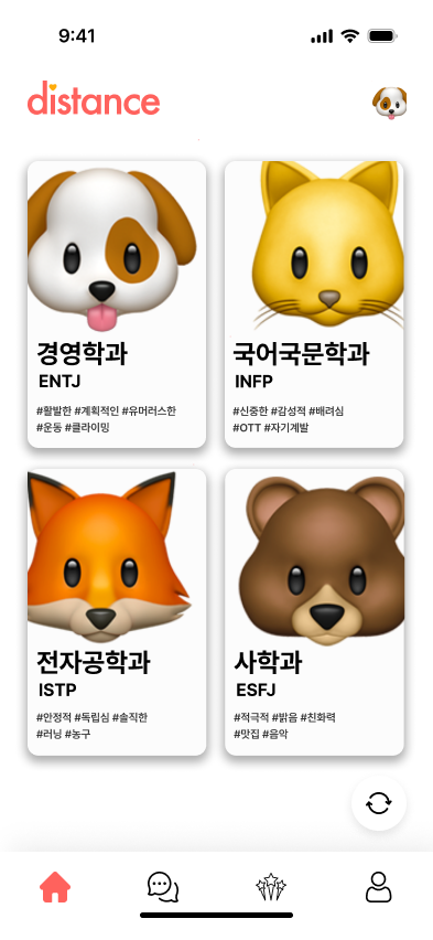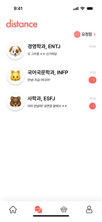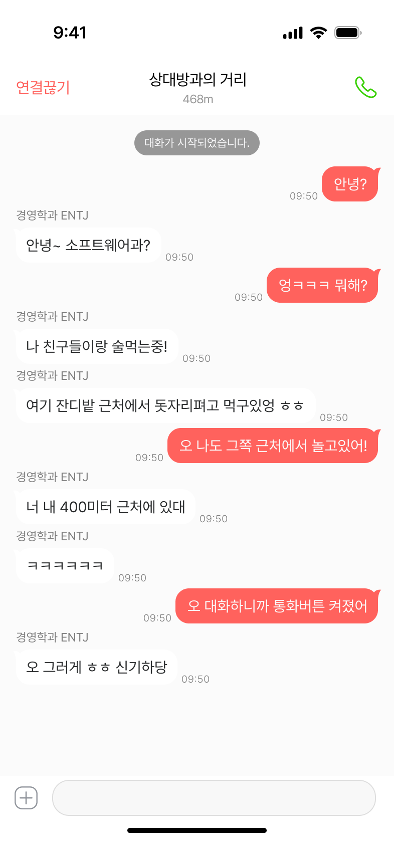 이러한 문제점들을 해결하기 위해 두 가지 핵심 기능을 도입했습니다. 첫째로, 회원가입 시 학생증 인증을 필수로 하여 서로 같은 학교 학생임을 확신할 수 있게 했습니다. 둘째로, 서로의 거리와 소속 학과를 공개함으로써 유저가 실제로 가까이에 있는 우리 학교 학생과 연결되고 있다는 현실감을 제공하고자 했습니다.