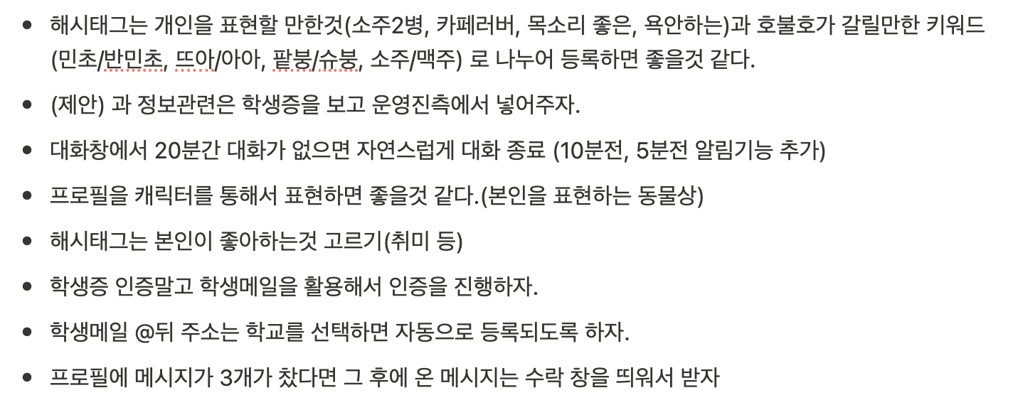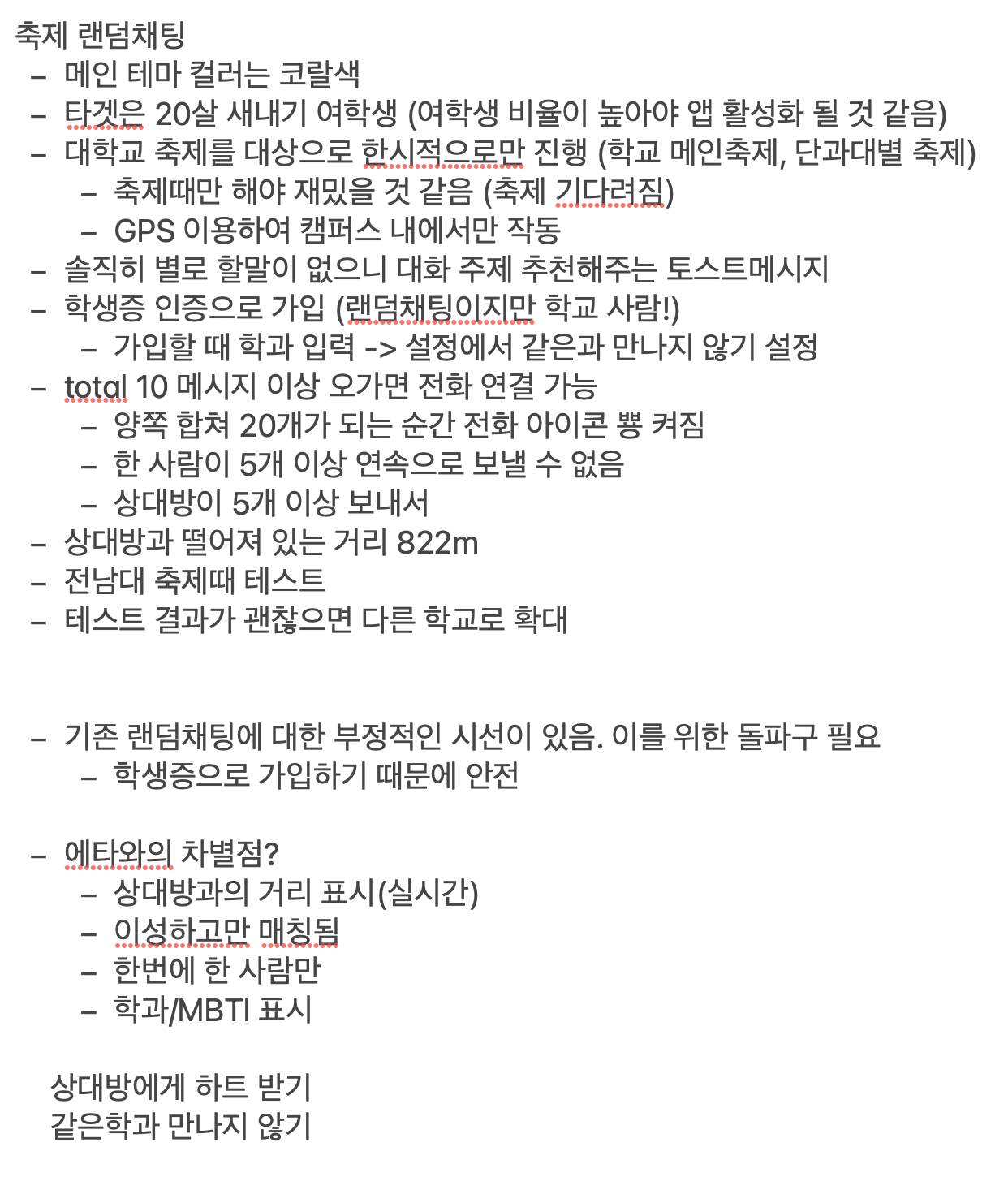 그래서 에브리타임에는 없는 위치기반 기능과 대학생이 주 유저층이라는 특성, 그리고 익명성을 잘 섞어서 기초적인 아이디어를 메모장에 빠르게 작성했습니다. 에브리타임과는 차별화될 수 있도록 성별구분을 확실히 하고, 대학에서 가장 핫한 이벤트인 대학축제에서 홍보하면 좋을 것 같다는 생각을 했습니다.
