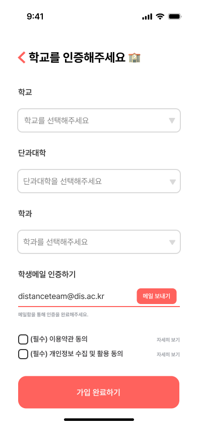 가장 기억에 남는 피드백은 회원가입 과정이 너무 길다는 점이었습니다. 저희가 구성한 회원가입 화면은 계정 가입 화면과 학교 인증 화면으로 구성되어 있었습니다. 외부인의 유입을 차단하기 위해 학생인증을 완료한 유저만 앱에 진입이 가능하게 설계했는데요. 하지만 이 점이 신규 유저 유입에 악영향을 끼칠 수도 있다는 것을 깨닳았습니다.