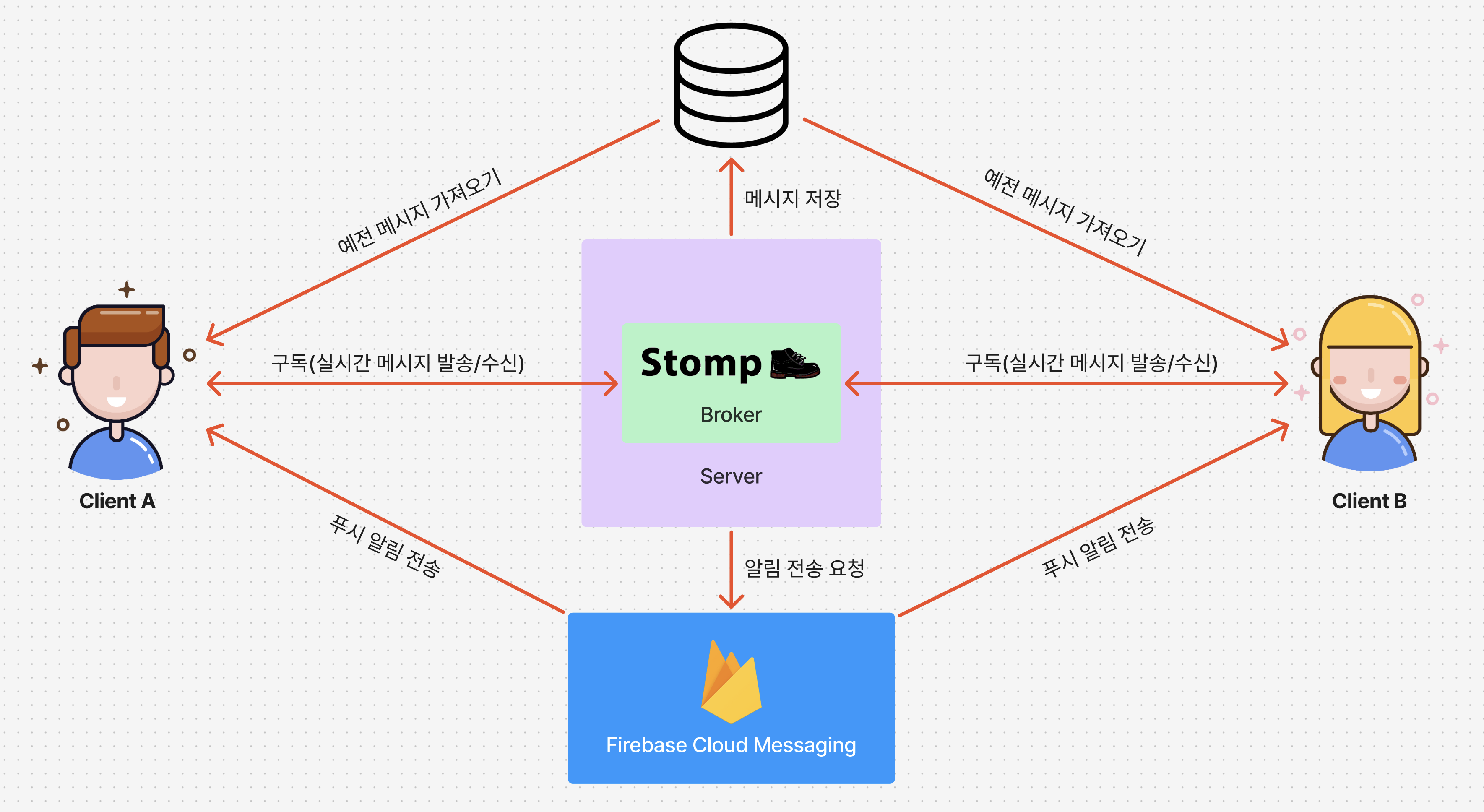 저희가 개발한 채팅 시스템은 다음과 같은 구조를 이룹니다. 서버 내에 있는 Stomp Broker가 클라이언트 사이의 실시간 메시지를 중계하는 역할을 수행합니다. Stomp가 메시지를 수신하면 DB에 해당 메시지를 저장함과 동시에 FCM에 푸시 알림을 보내줄 것을 요청합니다. 그러면 FCM이 해당하는 사람에게 알림을 전송합니다. 예를 들어, A 유저가 메시지를 전송하면 B 유저에게만 알림을 보내는 식입니다. 이 구조는 현재까지 이어져오고 있습니다.